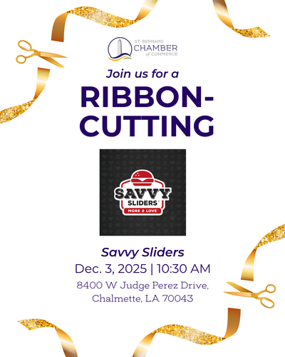 Come out and celebrate alongside St. Bernard Parish Government, Chamber members, and community leaders as we officially welcome Savvy Sliders to our growing business community. Enjoy the excitement, meet the owners, and show your support for this fantastic new local restaurant.